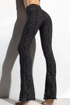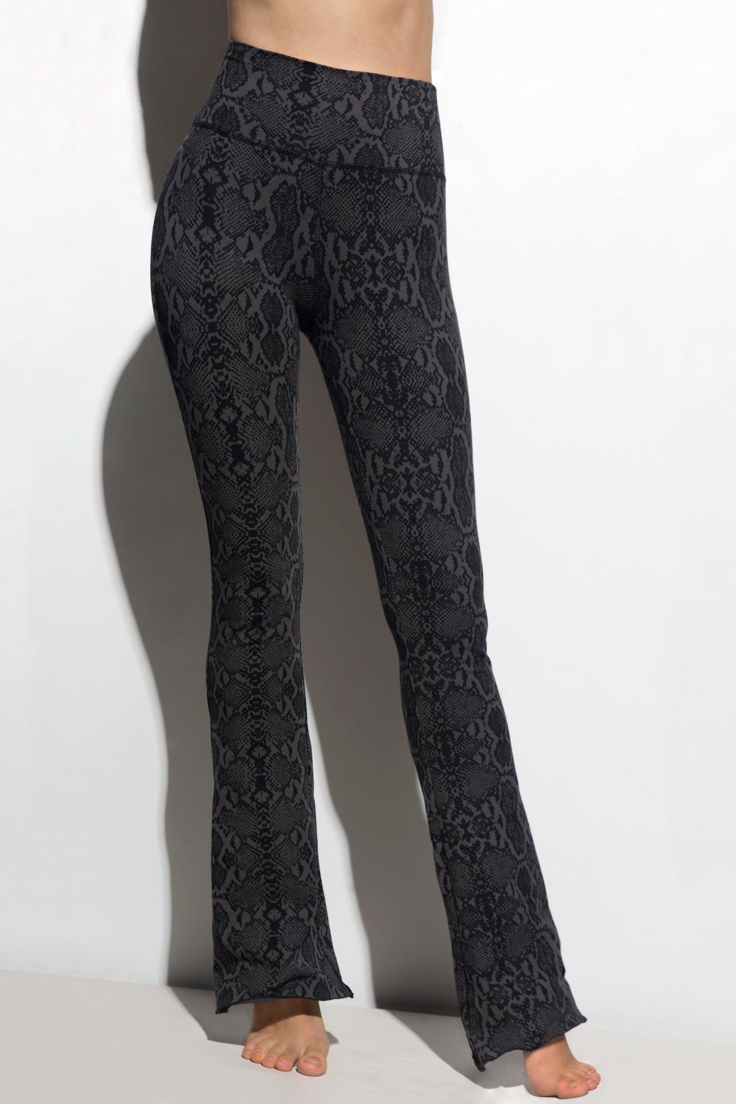 Deze originele bootleg legging is verkrijgbaar in een zwartgrijze slangenprint met een uitlopende pijpen die tot net onder de knie komen. Onze yoga flares zijn perfect om in te stretchen, want de hoogwaardige katoenen spandex beweegt met je lichaam mee. Je hoeft je geen zorgen te maken dat je legging te wijd wordt bij je billen of knieën, want dankzij de 4-way stretch sluiten ze perfect aan op je figuur en blijven ze perfect in vorm.