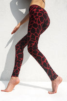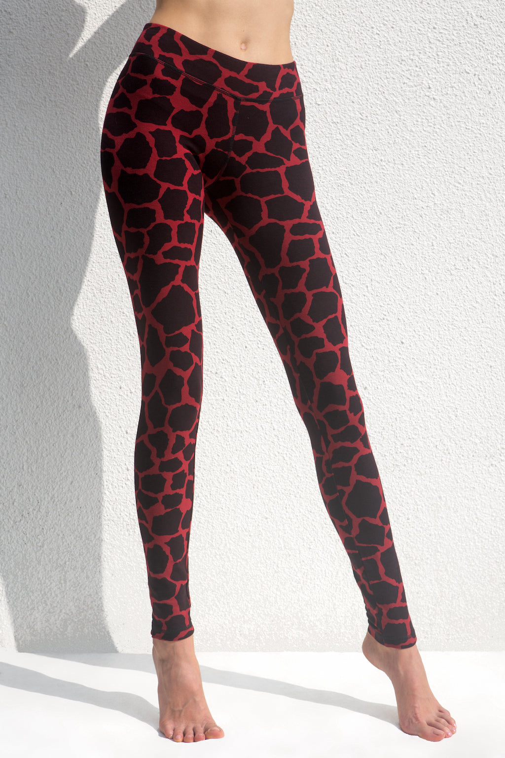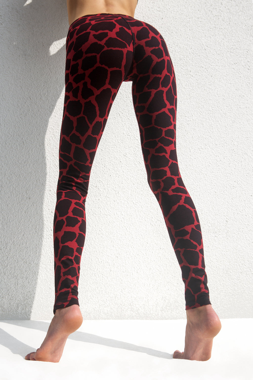 Een fantastische rode legging met een zwarte giraffenprint, die wasbeurt na wasbeurt mooi blijft.