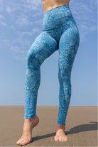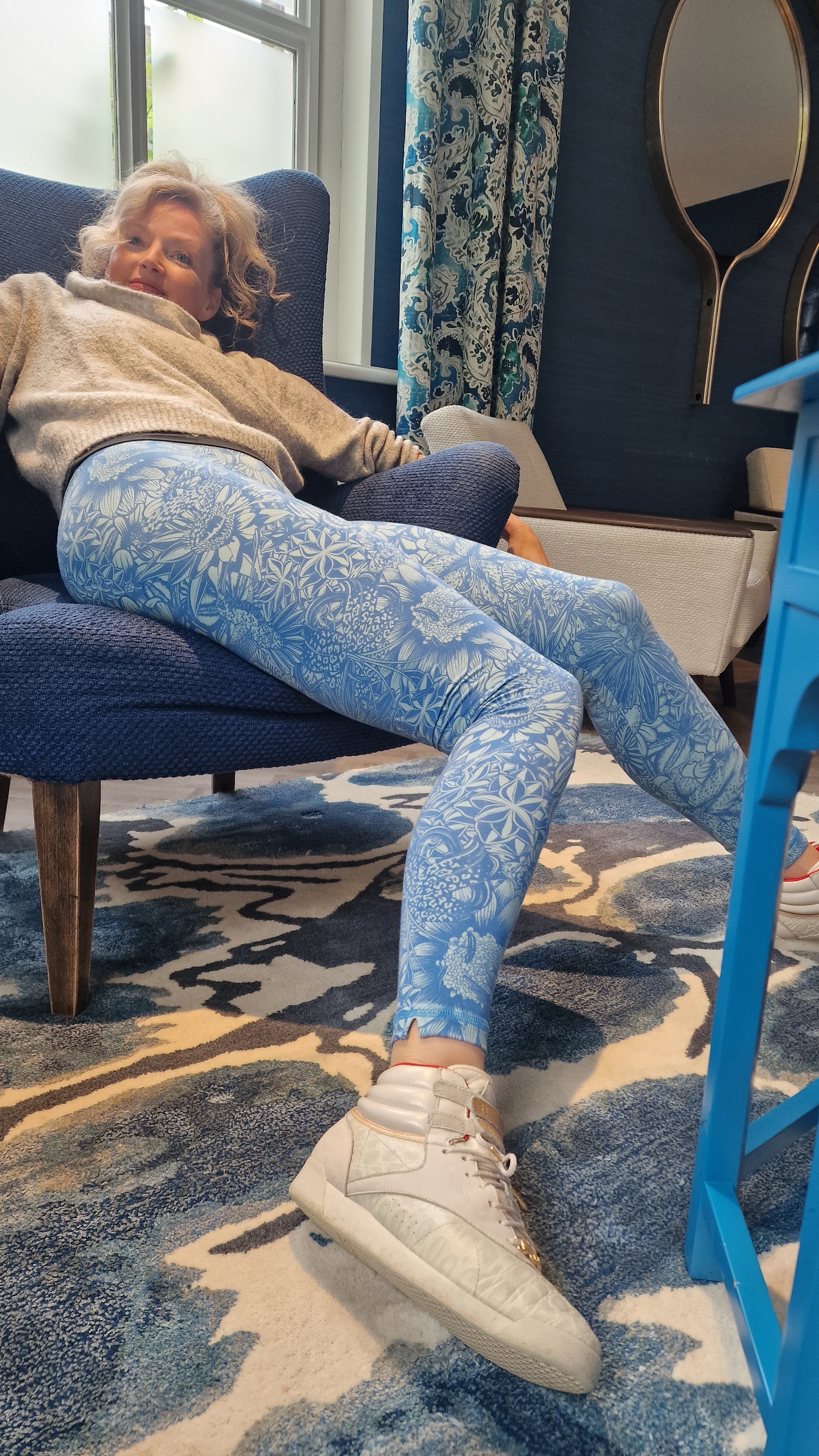 Lichtblauwe legging met hoge taille en bloemenprint in het blauw.