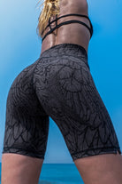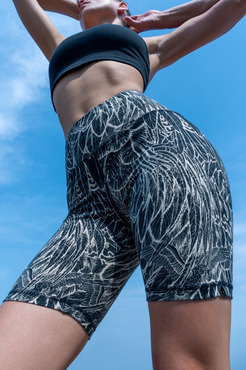 Supercomfortabele high waist bikershorts, onze hotpants met langere pijpen. Gemaakt van stretchkatoen met zwarte, crèmekleurige verenprint.